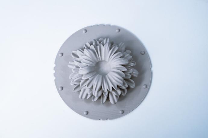 On a donc imprimé ces quatre fleurs uniques. Ce sont nos "maîtres-modèles". Il fallait qu'elles soient parfaites, car ce sont elles qui ont servi de base pour créer tous les moules de la série. Et grâce à nos machines à Roubaix, on a pu respecter exactement les dessins de la Cheffe.